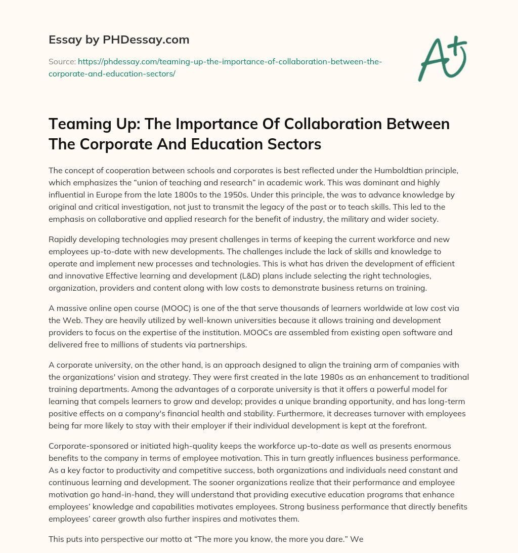 The Humboldtian Principle and Effective Learning and Development Plans for Industry and Society. (2018, Sep 25). Retrieved from https://phdessay.com/teaming-up-the-importance-of-collaboration-between-the-corporate-and-education-sectors/Cite this Page