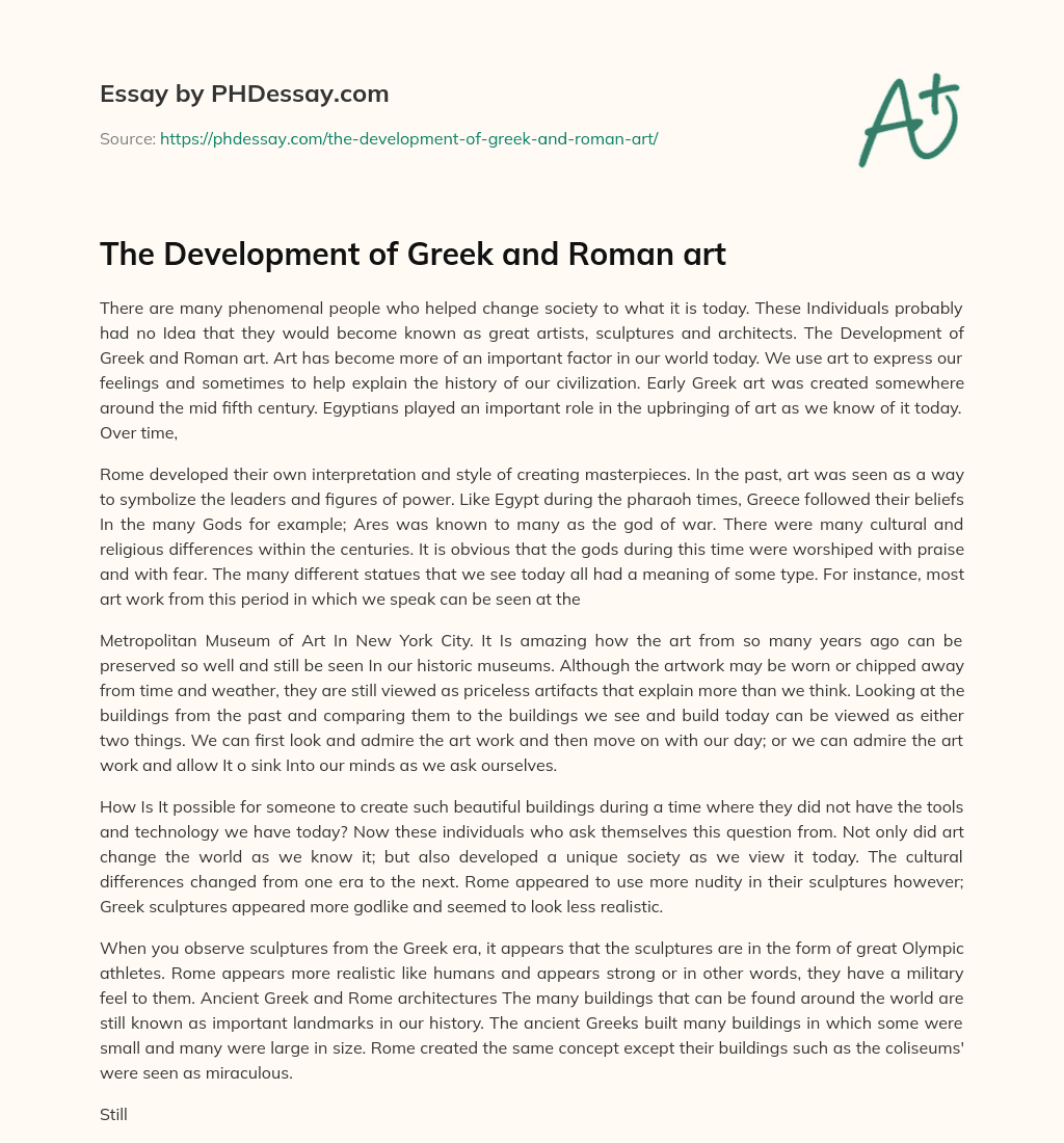 The Development of Greek and Roman art. (2018, Sep 27). Retrieved from https://phdessay.com/the-development-of-greek-and-roman-art/