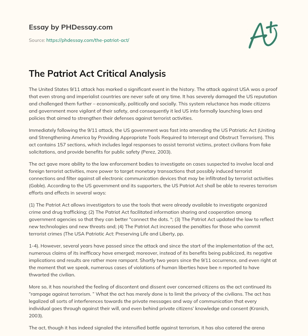 The Patriot Act Critical Analysis. (2016, Aug 12). Retrieved from https://phdessay.com/the-patriot-act/