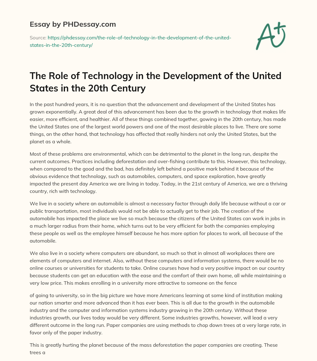 The Role of Technology in the Development of the United States in the 20th Century. (2016, Aug 22). Retrieved from https://phdessay.com/the-role-of-technology-in-the-development-of-the-united-states-in-the-20th-century/
