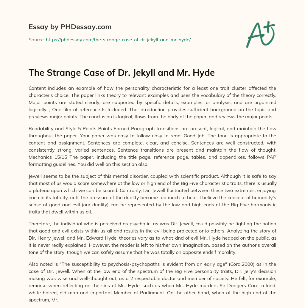 Also noted is "The susceptibility to psychosis-psychopaths is evident from an early age" (Cord,2000) as in the case of Dir. Jewell. When at the low end of the spectrum of the Big Five personality traits, Dir. Jelly's decision making was wise and well-thought out, as a 2 respectable doctor and member of society. He felt, for example, remorse when reflecting on the sins of Mr.. Hyde, such as when Mr.. Hyde murders Sir Dangers Care, a kind, white haired, old man and important Member of Parliament. On the other hand, when at the high end of the spectrum, Mr..