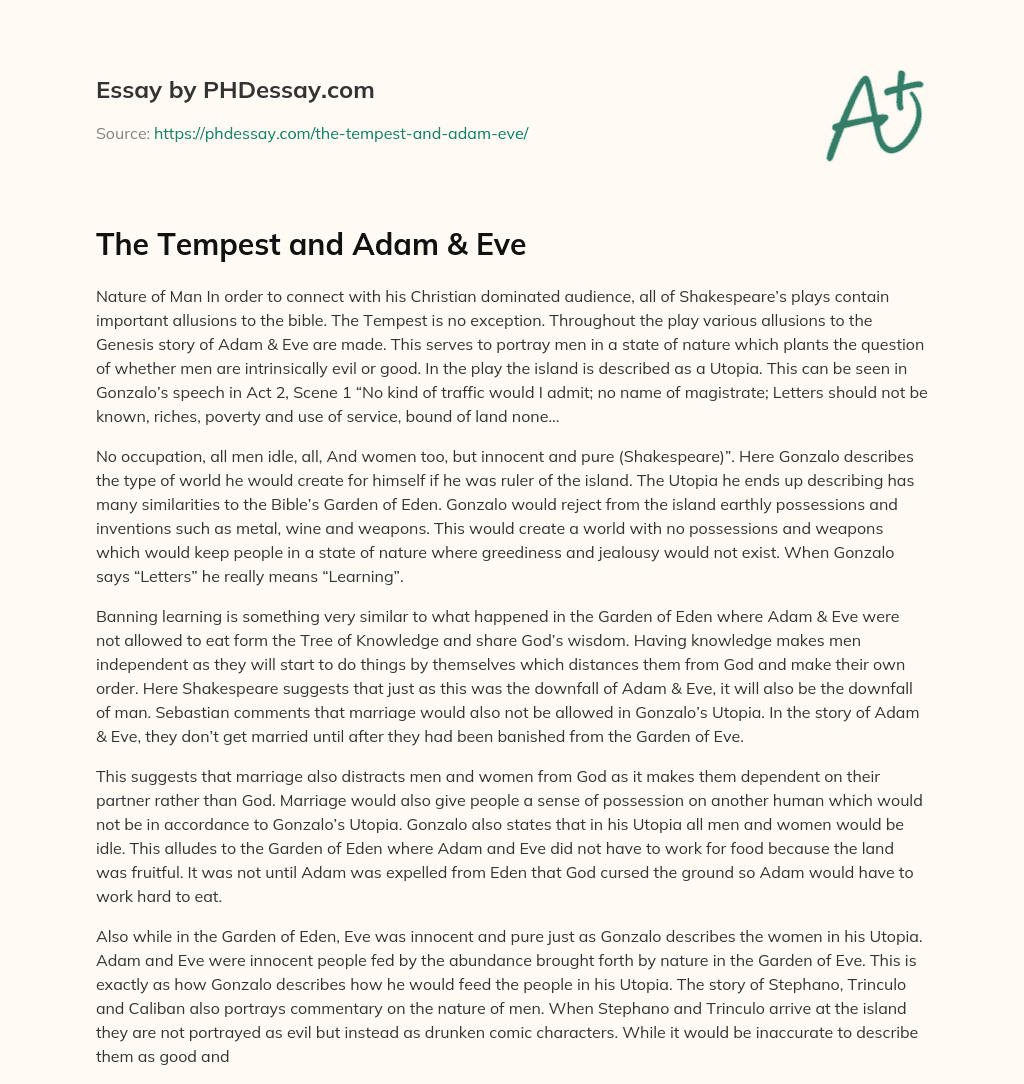 Order custom essay The Tempest and Adam & Eve with free plagiarism report