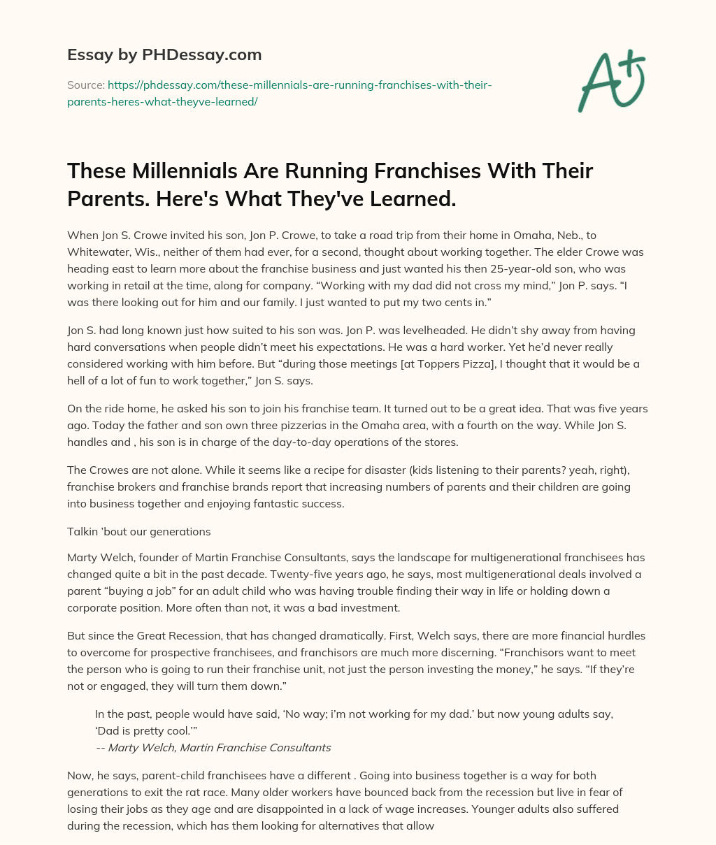Order custom essay These Millennials Are Running Franchises With Their Parents. Here’s What They’ve Learned. with free plagiarism report