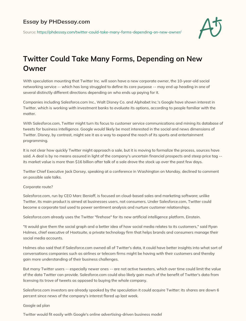 Order custom essay Twitter Could Take Many Forms, Depending on New Owner with free plagiarism report