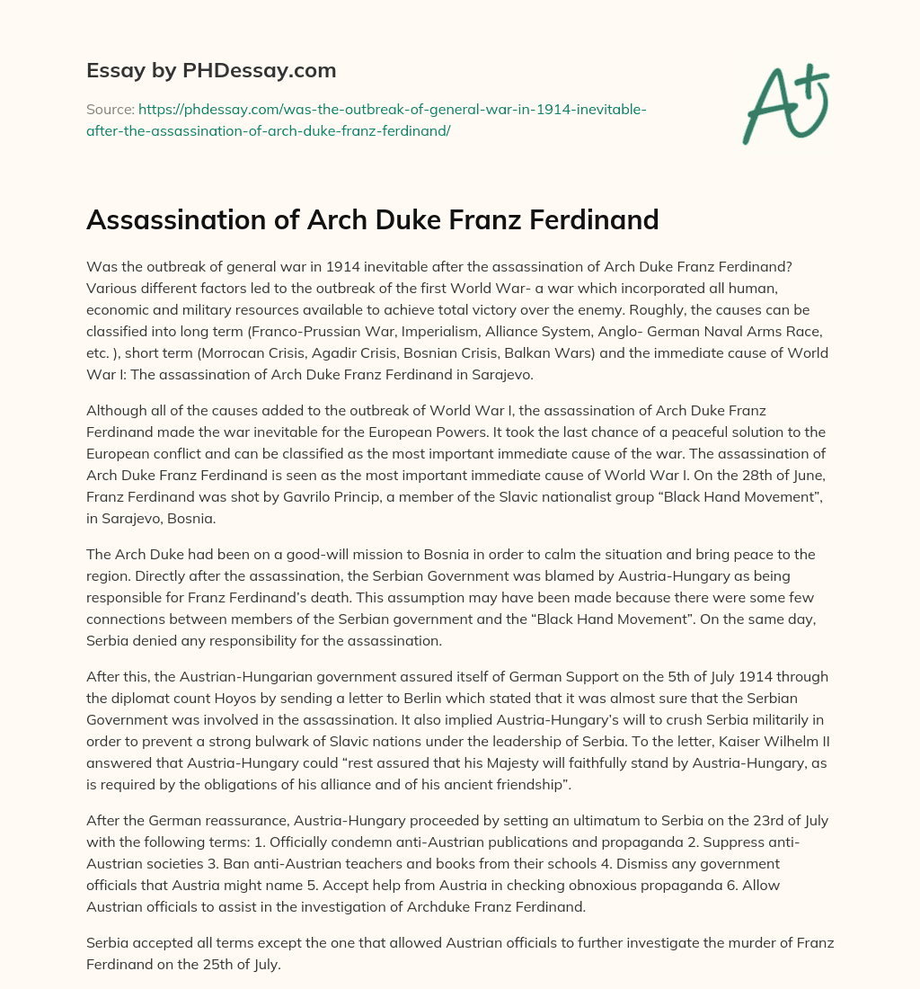 Assassination of Arch Duke Franz Ferdinand. (2018, Jul 03). Retrieved from https://phdessay.com/was-the-outbreak-of-general-war-in-1914-inevitable-after-the-assassination-of-arch-duke-franz-ferdinand/