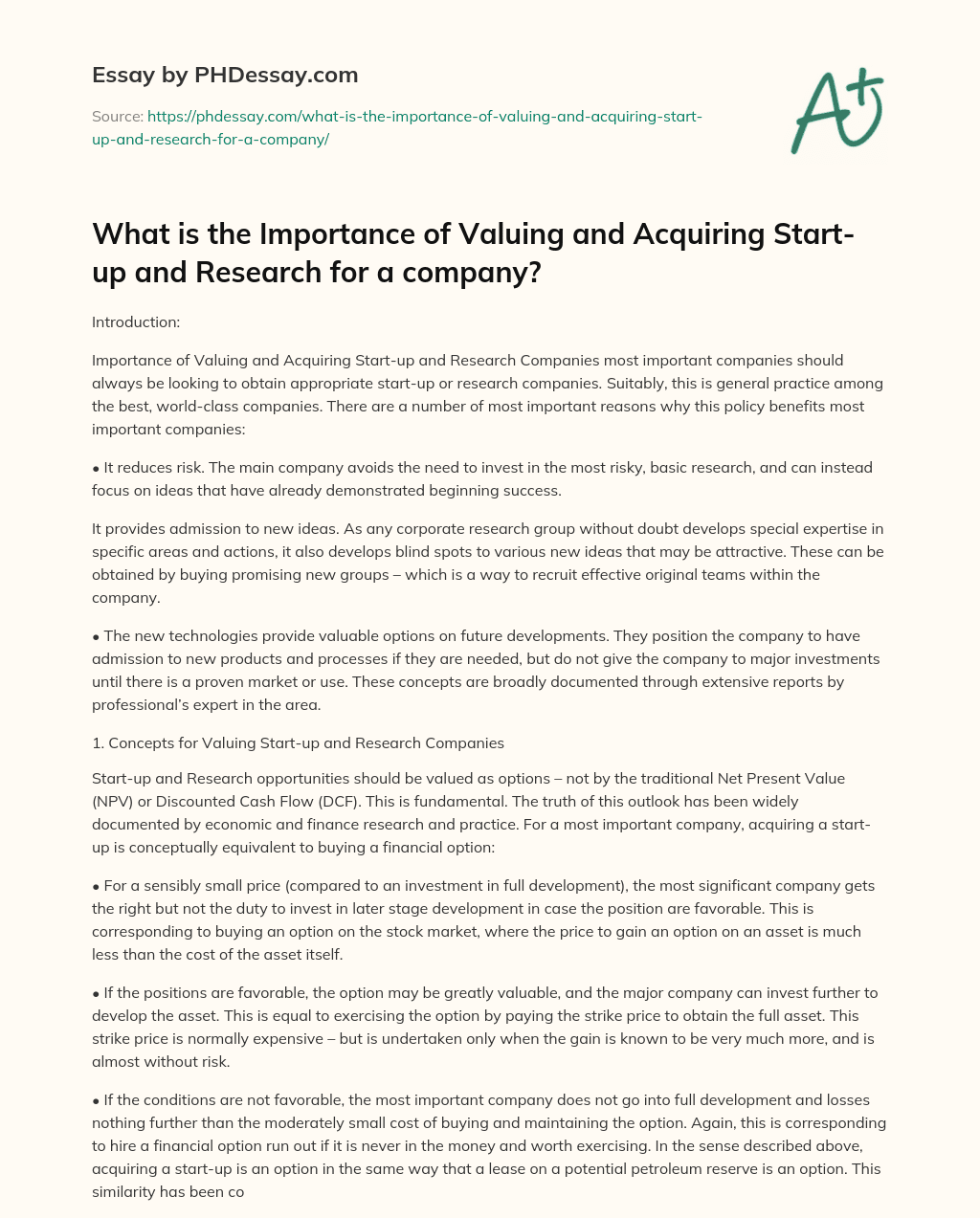 What is the Importance of Valuing and Acquiring Start-up and Research for a company?. (2019, Mar 22). Retrieved from https://phdessay.com/what-is-the-importance-of-valuing-and-acquiring-start-up-and-research-for-a-company/Cite this Page