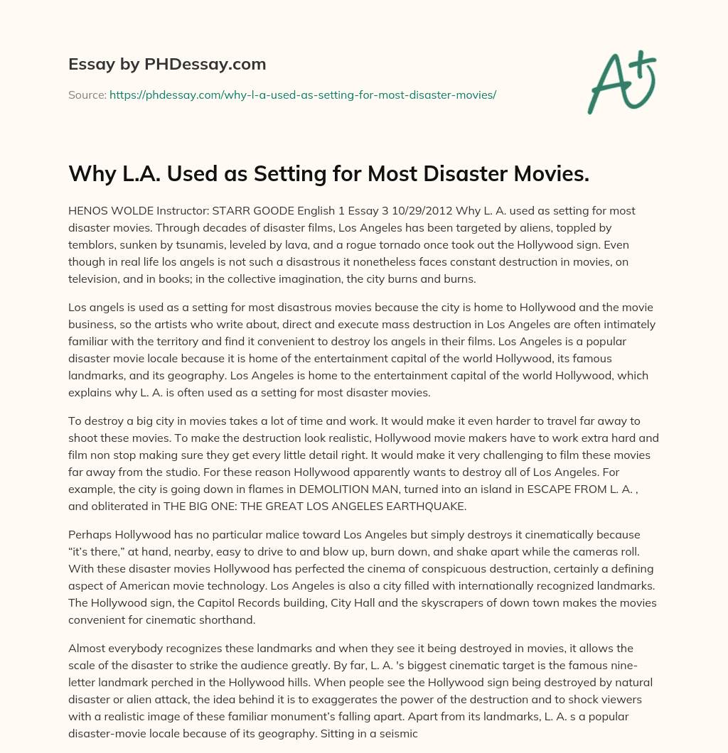 Why L.A. Used as Setting for Most Disaster Movies.. (2016, Dec 31). Retrieved from https://phdessay.com/why-l-a-used-as-setting-for-most-disaster-movies/